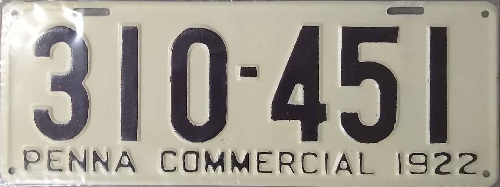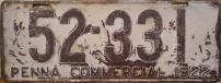There were two configurations of plates: (Type 1) "COMMERCIAL" at the top and "PENNA" at the bottom and height is 7", and (Type 2) "PENNA COMMERCIAL" at the bottom and height is 6". Plate widths are as follows: - 1 - 4 digits: 12" - 5 digits: 13 1/2" - 6 digits: 16"